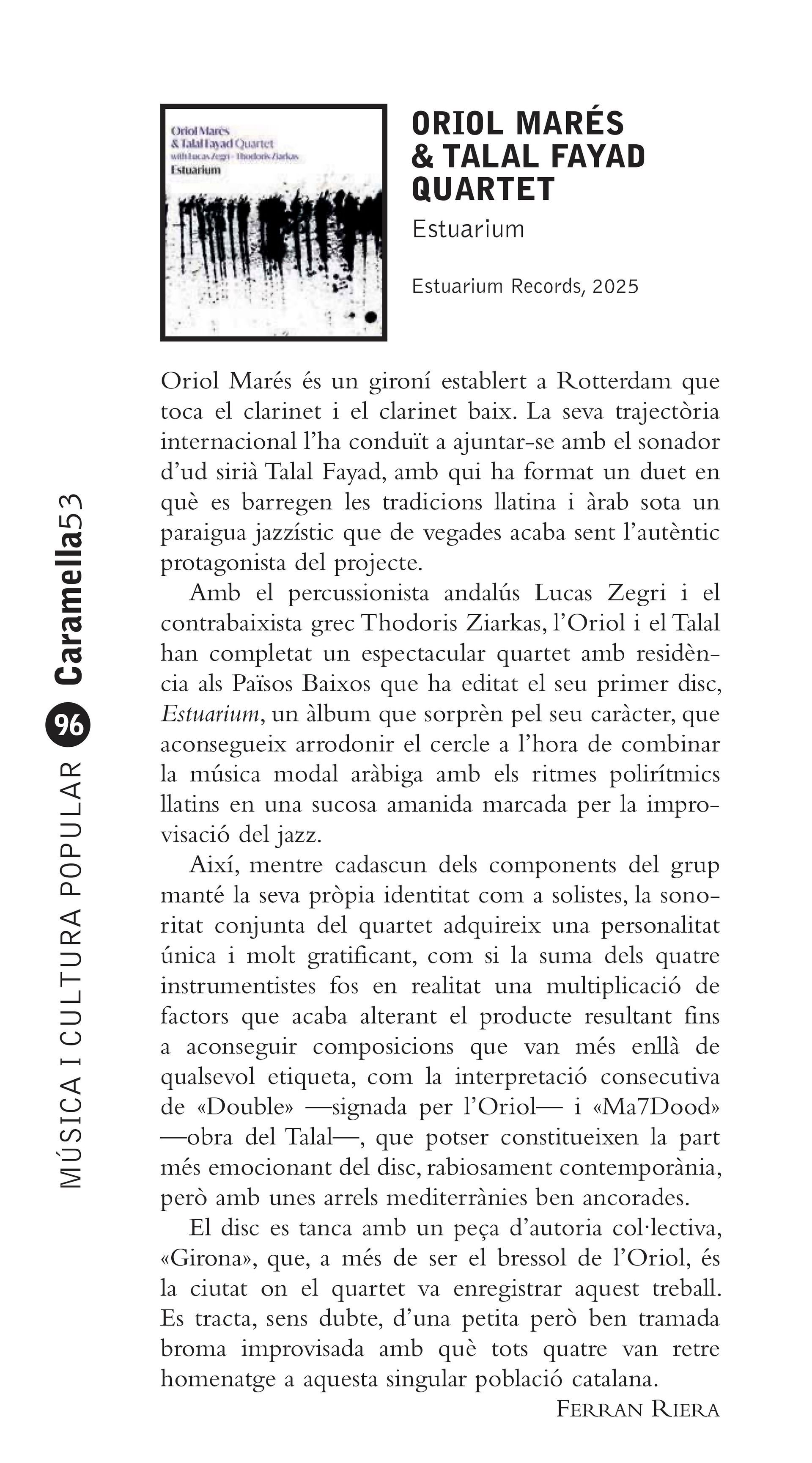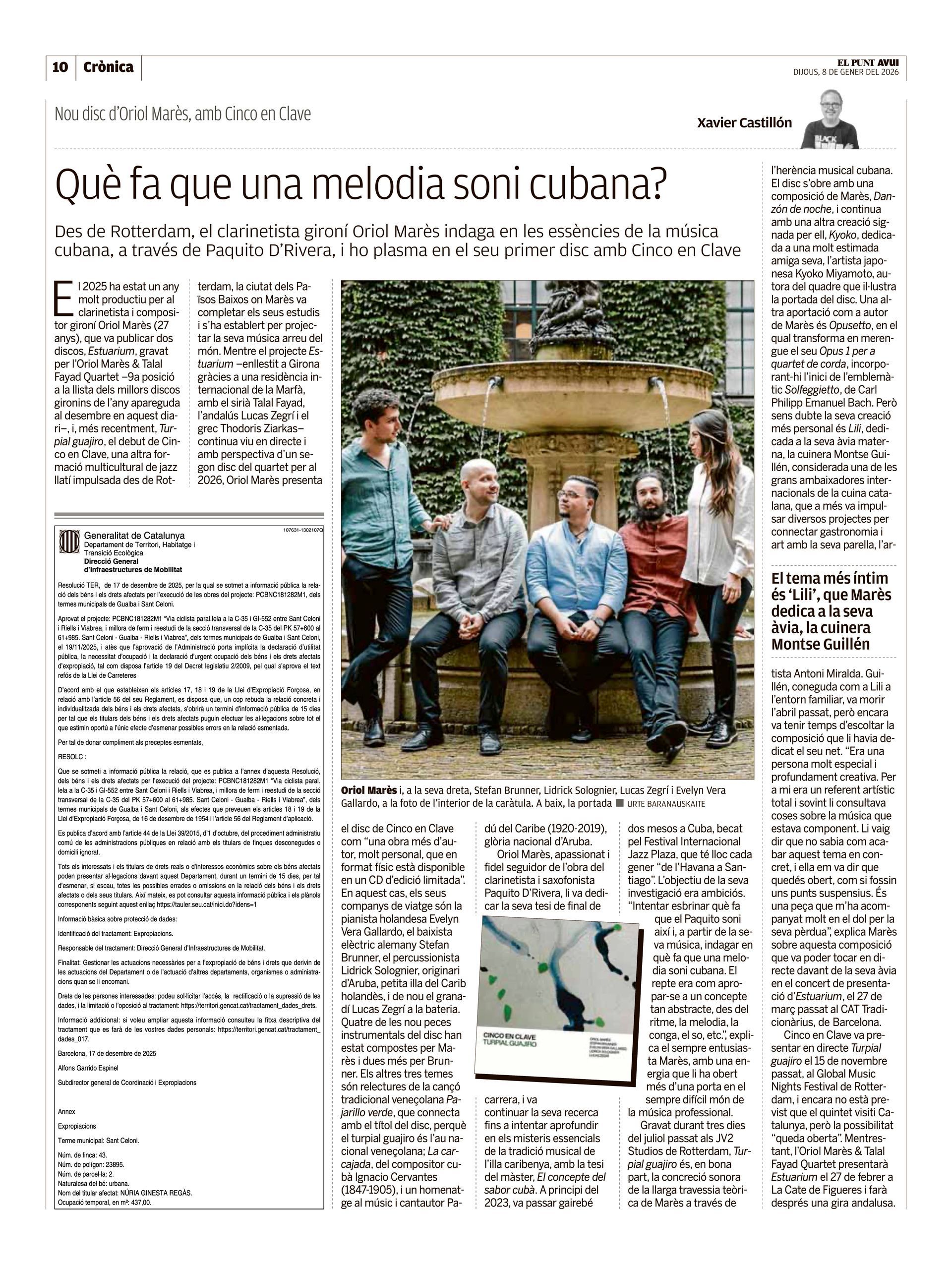 The year 2025 has been a very productive one for the clarinetist and composer from Girona Oriol Marès (27), who released two albums: Estuarium, recorded by the Oriol Marès & Talal Fayad Quartet—ranked 9th on this newspaper’s list of the best albums from Girona of the year published in December—and, more recently, Turpial guajiro, the debut of Cinco en Clave, another multicultural Latin jazz ensemble based in Rotterdam, the Dutch city where Marès completed his studies and settled in order to project his music worldwide. While the Estuarium project—completed in Girona thanks to an international residency at La Marfà, with the Syrian Talal Fayad, the Andalusian Lucas Zegrí, and the Greek Thodoris Ziarkas—remains very much alive on stage and with the prospect of a second quartet album in 2026, Oriol Marès presents the Cinco en Clave album as “a more author-driven, very personal work, which in physical format is available as a limited-edition CD.