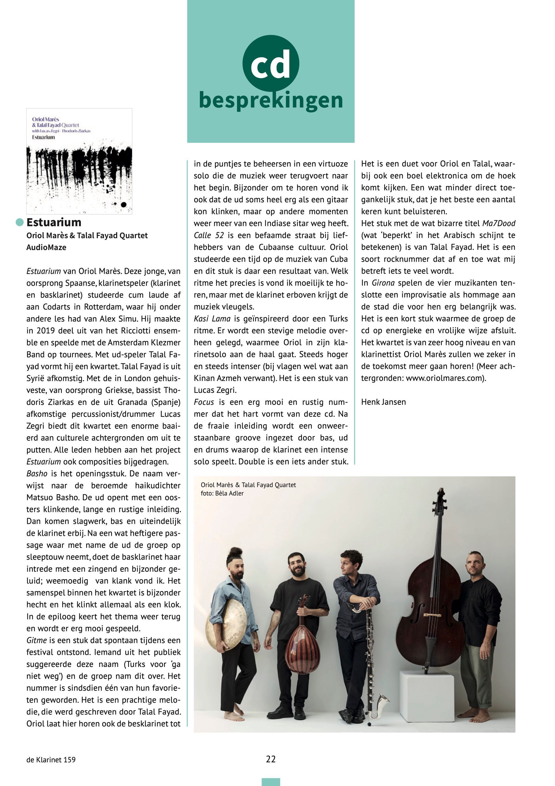 "Estuarium by Oriol Marès. This young, originally Spanish, clarinetist (clarinet and bass clarinet) graduated cum laude from Codarts in Rotterdam, where he studied, among others, with Alex Simu. In 2019 he was part of the Ricciotti ensemble and toured with the Amsterdam Klezmer Band. Together with ud player Talal Fayad, he forms a quartet. Talal Fayad is originally from Syria. With the London-based, originally Greek, bassist Thodoris Ziarkas and the percussionist/drummer Lucas Zegri from Granada (Spain), this quartet offers a huge range of cultural backgrounds to draw from. All members have also contributed compositions to the Estuarium project."