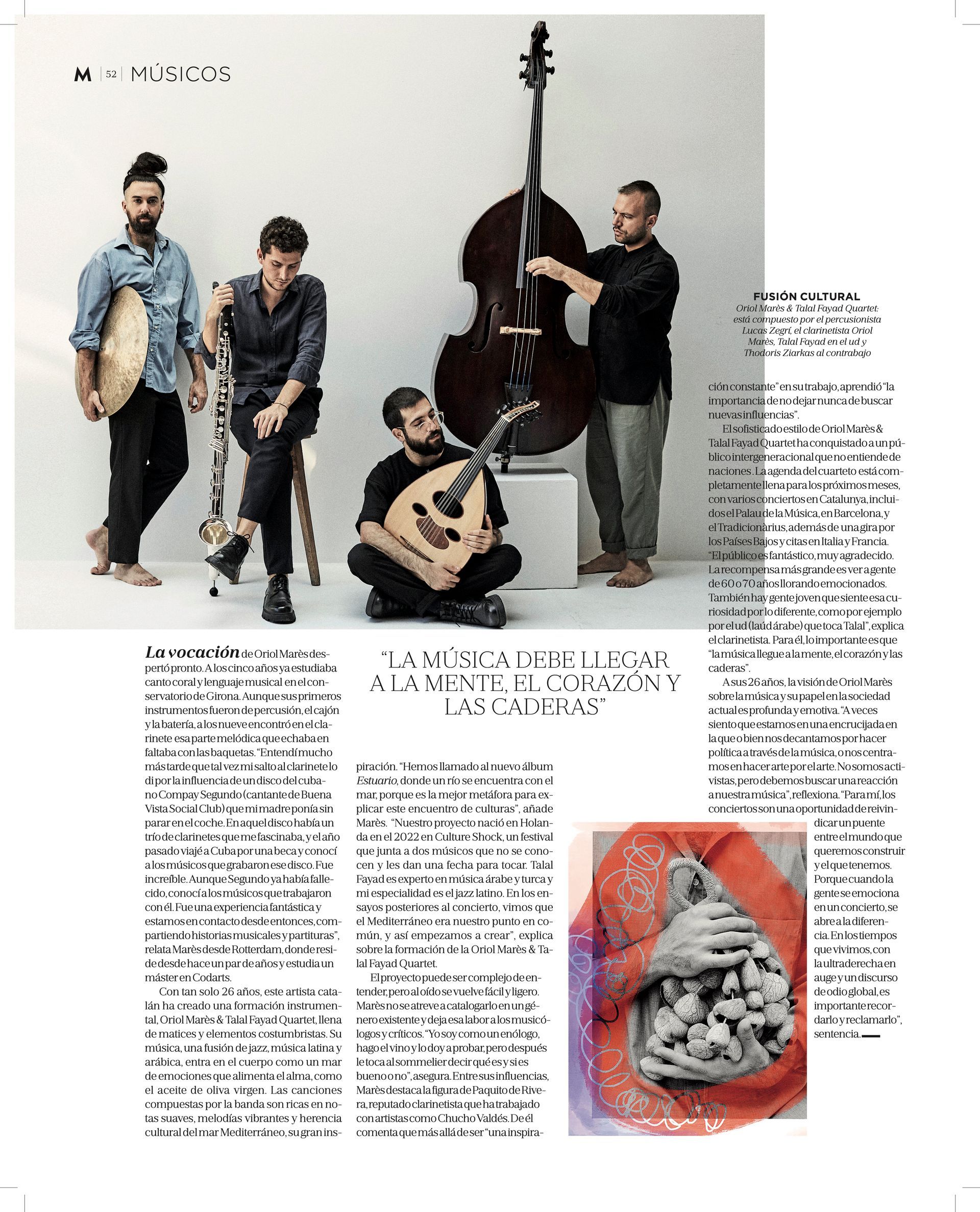 “Hemos llamado al nuevo álbum Estuarium, donde un río se encuentra con el mar, porque es la mejor metáfora para explicar este encuentro de culturas”, añade Marès. “Nuestro proyecto nació en Holanda en el 2022 en Culture Shock, un festival que junta a dos músicos que no se conocen y les dan una fecha para tocar. Talal Fayad es experto en música árabe y turca y mi especialidad es el jazz latino. En los ensayos posteriores al concierto, vimos que el Mediterráneo era nuestro punto en común, y así empezamos a crear”, explica sobre la formación de la Oriol Marès & Talal Fayad Quartet.
